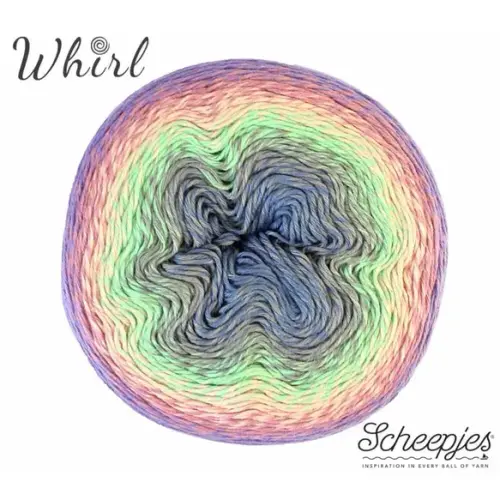 Het assortiment van Scheepjes Whirl biedt een enorme keus aan prachtige gemêleerde garens met een mooi en lang kleurverloop. Het garen is gemaakt van 60% katoen en 40% acryl en is daardoor uitermate geschikt voor het haken of breien van luchtige en lichtgewicht projecten die bijzonder mooi vallen. Scheepjes Whirl is een zogenaamd unicatgaren waarbij het kleurverloop per draad verspringt, wat uw brei- of haakwerk een uniek gemêleerd effect geeft. In tegenstelling tot andere unicatgarens is Whirl echter getwijnd en dat voorkomt dat het garen bij snel breien of haken splijt. Elke kleurwisseling is zorgvuldig met de hand geknoopt, zodat de knoopjes onopvallend wegvallen in de steken en het werk een mooie en gladde afwerking krijgt. De extra grote Scheepjes Whirl garencakes hebben een looplengte van maar liefst 1000 meter, ruim voldoende voor een grote sjaal of omslagdoek. Scheepjes Whirl is geschikt voor naalddikte 3.50-4.00mm (garendikte Fingering).