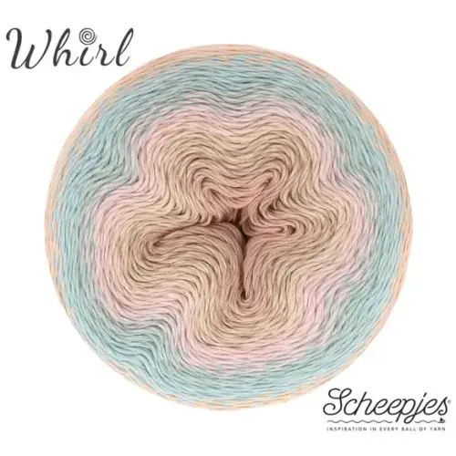 Het assortiment van Scheepjes Whirl biedt een enorme keus aan prachtige gemêleerde garens met een mooi en lang kleurverloop. Het garen is gemaakt van 60% katoen en 40% acryl en is daardoor uitermate geschikt voor het haken of breien van luchtige en lichtgewicht projecten die bijzonder mooi vallen. Scheepjes Whirl is een zogenaamd unicatgaren waarbij het kleurverloop per draad verspringt, wat uw brei- of haakwerk een uniek gemêleerd effect geeft. In tegenstelling tot andere unicatgarens is Whirl echter getwijnd en dat voorkomt dat het garen bij snel breien of haken splijt. Elke kleurwisseling is zorgvuldig met de hand geknoopt, zodat de knoopjes onopvallend wegvallen in de steken en het werk een mooie en gladde afwerking krijgt. De extra grote Scheepjes Whirl garencakes hebben een looplengte van maar liefst 1000 meter, ruim voldoende voor een grote sjaal of omslagdoek. Scheepjes Whirl is geschikt voor naalddikte 3.50-4.00mm (garendikte Fingering).